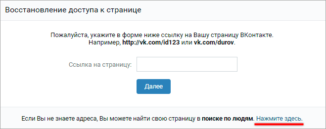 - если не знаете адрес своего профиля, кликните внизу по «Нажмите здесь»;