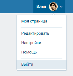 В первом случае надо лишь выполнить выход из чужого профиля, а затем зайти в свою анкету. Чтобы выйти из своего аккаунта, нажмите в верхнем правом углу экрана на имя пользователя и выберите опцию «Выйти».